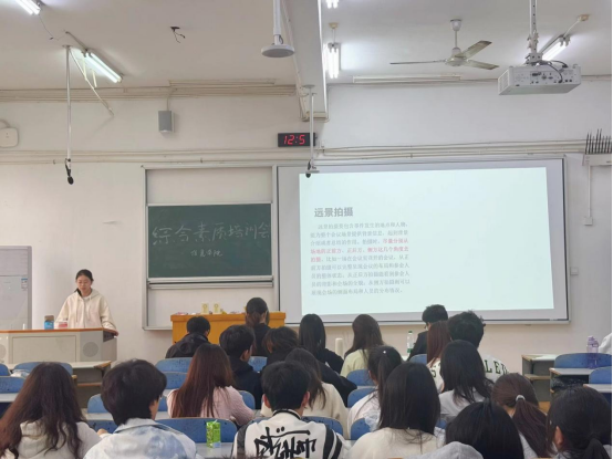 青年传媒中心干事张锦嘉讲解了会议拍摄技巧,包括远景、中景、近景等不同景别的运用及拍摄时机的把握,并提醒注意照片中人物神情是否自然。
